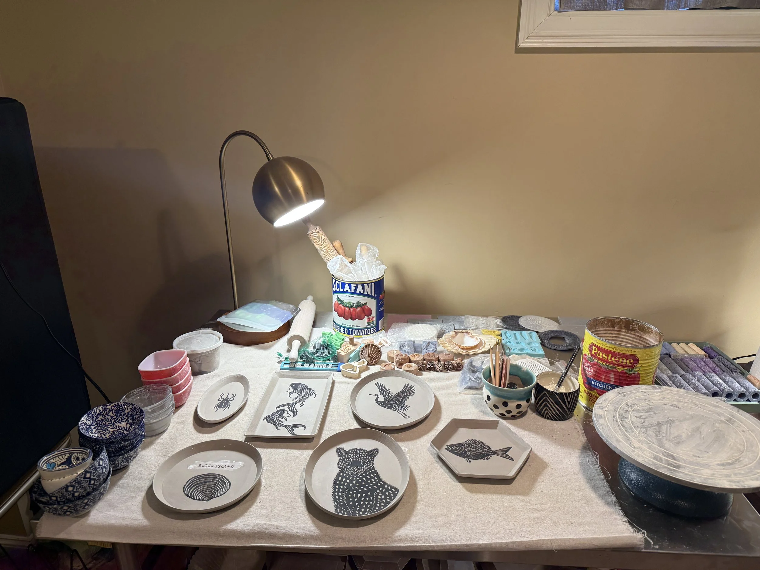 A creative/art director, graphic designer, photographer/videographer by day, I turn to ceramics for a more tactile expression of my design aesthetic. My mother is a ceramic artist and painter, and my father is a marble sculptor, and it recently occurred to me that I have merged their two methods when I apply the sgraffito technique to my animal plates!
